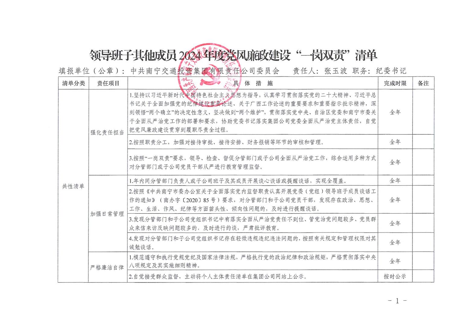 領(lǐng)導(dǎo)班子其他成員2024年度黨風(fēng)廉政建設(shè)“一崗雙責(zé)”清單(一)